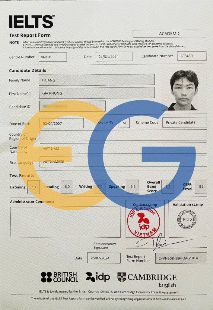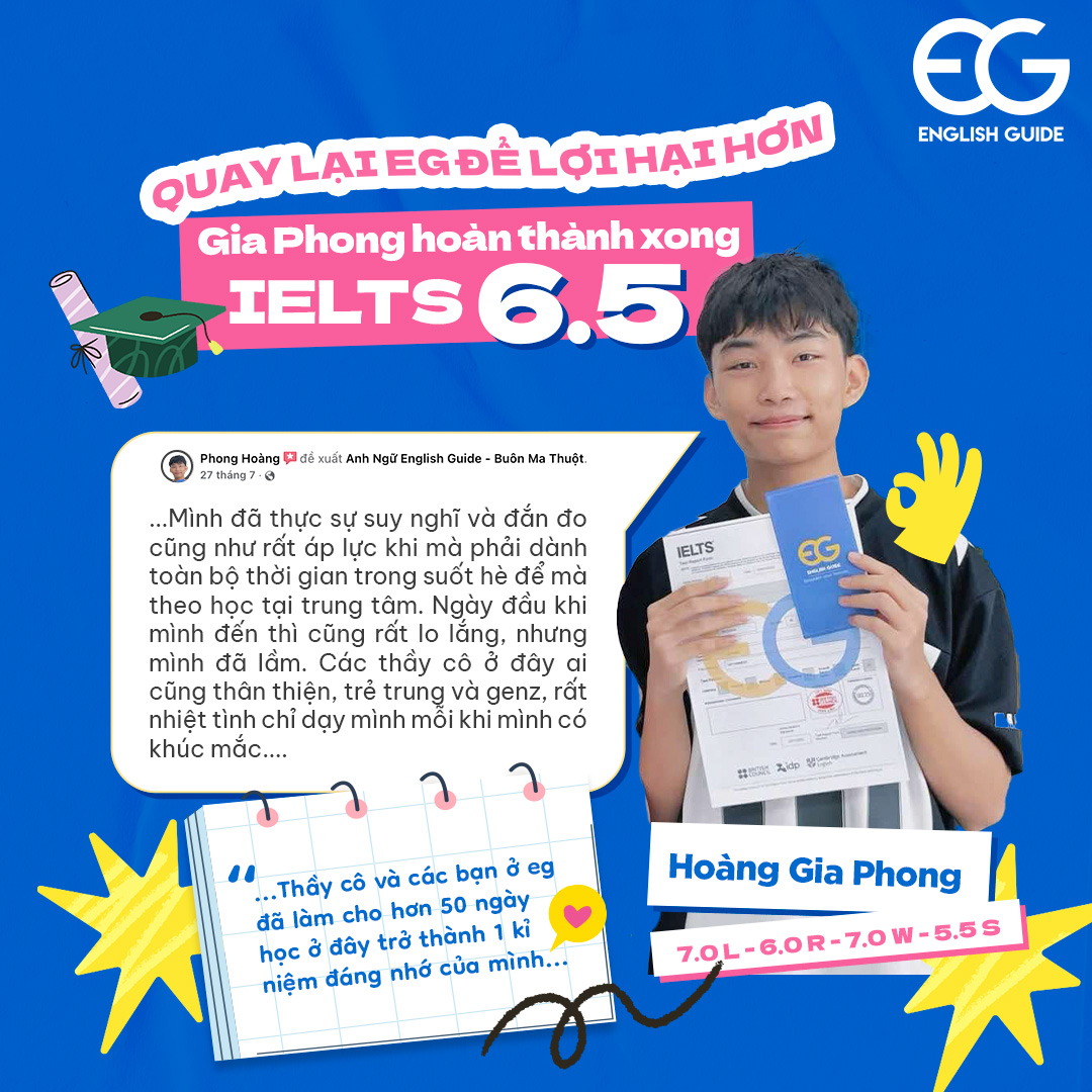 Với sự đồng hành kiên trì của gia đình, sự giảng dạy tận tâm từ các thầy cô English Guide và không thể không nhắc đến sự cố gắng tuyệt vời của bản thân, Phong đã xuất sắc đạt được mục tiêu của mình là IELTS 6.5 chính là một thành tích xứng đáng. Đây không chỉ là một điểm số mà còn là một sự lột xác, là dấu ấn đáng nhớ của tuổi trẻ.