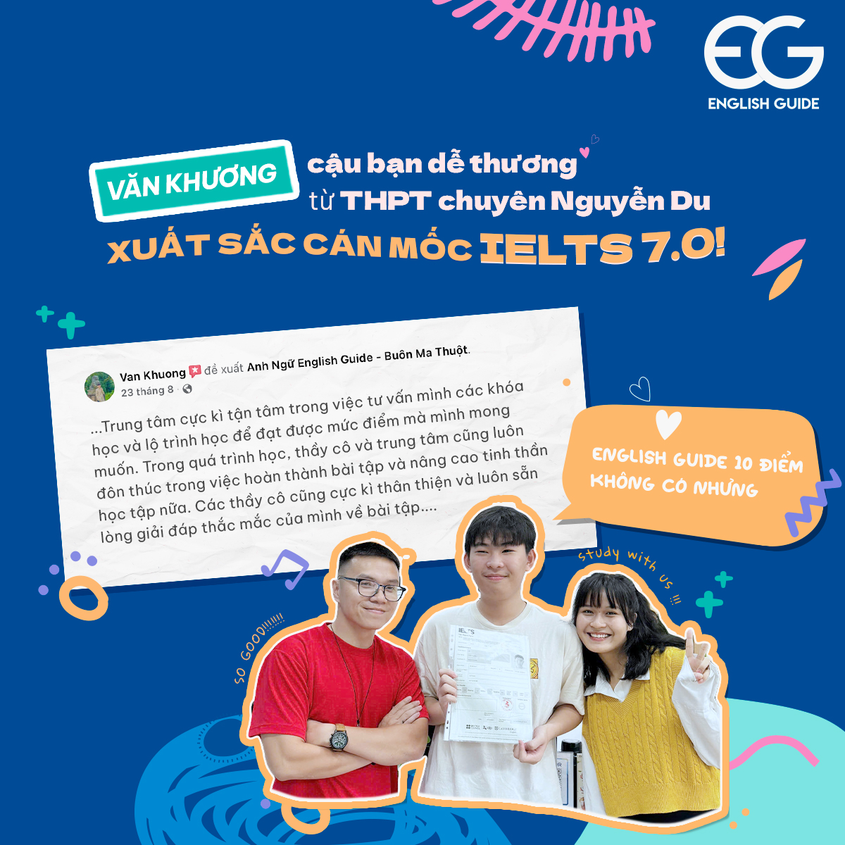 English Guide tự hào khi có thể là một phần trong hành trình chinh phục IELTS của Khương và chúc mừng bạn vì thành tích đáng tự hào, chúc Khương sẽ còn gặt hái được nhiều thành công hơn nữa trên con đường phía trước nhé!