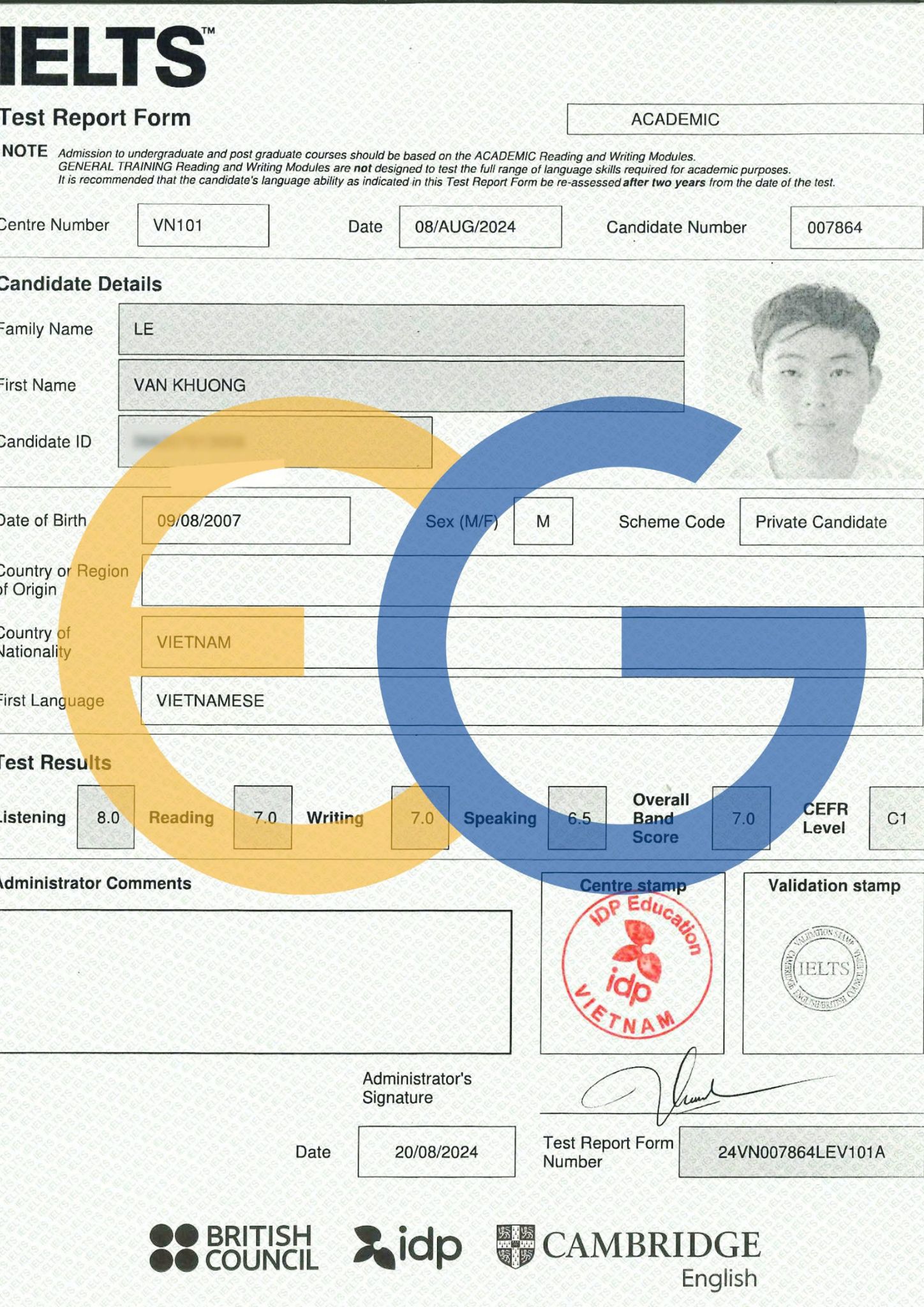 Sau khi kết thúc lộ trình 3 khóa Pre Ielts, Ielts Master và Ielts Advanced, Khương không còn là học sinh chập chững những bước đầu mà đã trưởng thành hơn, tự tin hơn. Được sự động viên của các thầy cô, Khương đã mạnh dạn đăng ký thi vào ngày 8/8/2024 và xuất sắc đạt band điểm mơ ước. Đây không chỉ là thành tích cá nhân mà còn là sự ghi nhận cho cả một hành trình kiên trì, cố gắng của Khương cùng sự đồng hành tận tâm từ đội ngũ giáo viên tại English Guide.