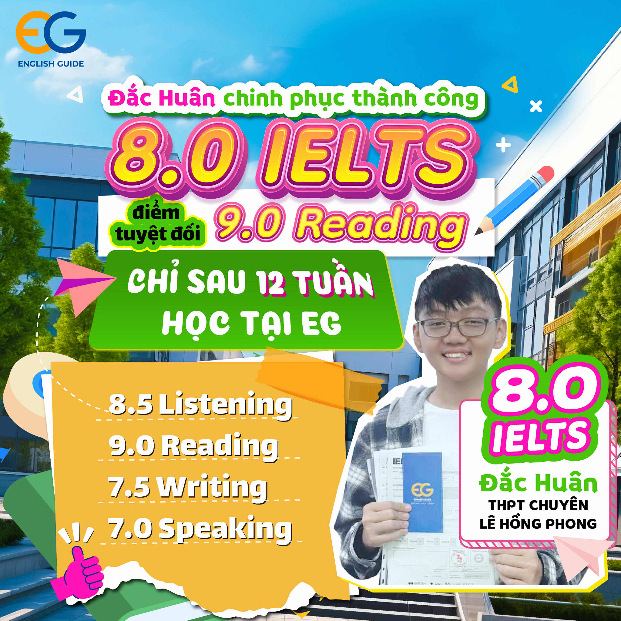 Xem tiếp >Đắc Huân chinh phục thành công 8.0 IELTS chỉ sau 12 tuần học tại English Guide