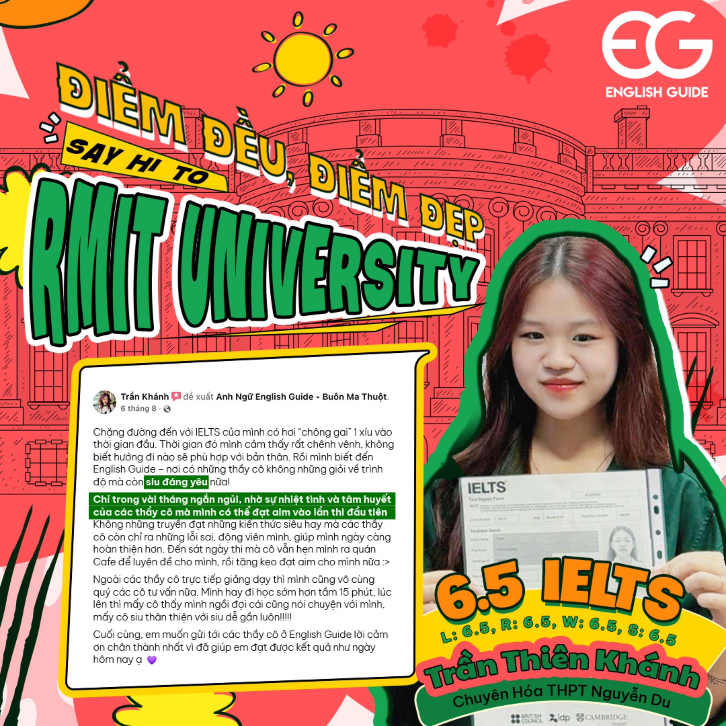 Xin chúc mừng Thiên Khánh – học sinh chuyên Hóa trường THPT Nguyễn Du, vừa hoàn thành xuất sắc mục tiêu chinh phục IELTS 6.5 không band nào dưới 6, đủ điều kiện xét tuyển vào Đại học RMIT!